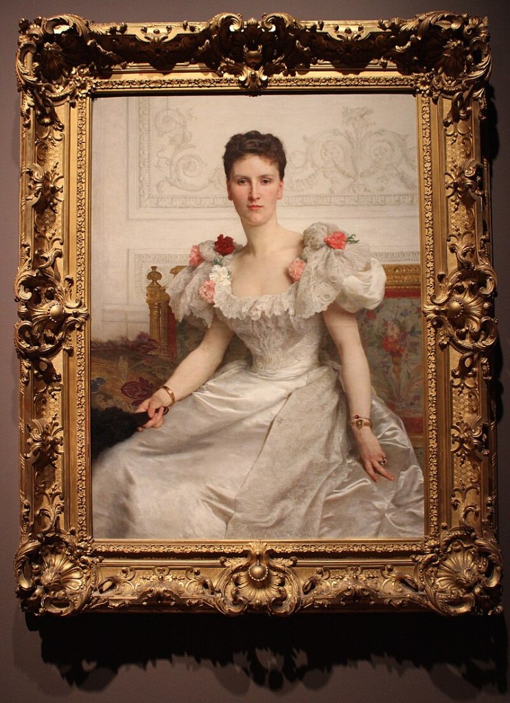 An example of a grossly over-framed painting according to the fashion of the time. It is a beautiful, hand crafted frame but it shouts opulence. Brightly gilded and elaborate it does not relate to the painting in any way. The portrait softly coloured needs a quiet, softly coloured frame to compliment it. A cassette or similar frame would be more appropriate. An ivory or off white, center panel and frosted gilding moulding to the outer and inner edge would be better. It would echo the soft colouring of the picture and the gentle, feminine theme. The softened gilding would add all the touch of brightness necessary.
