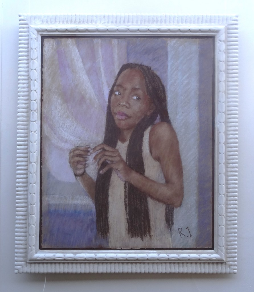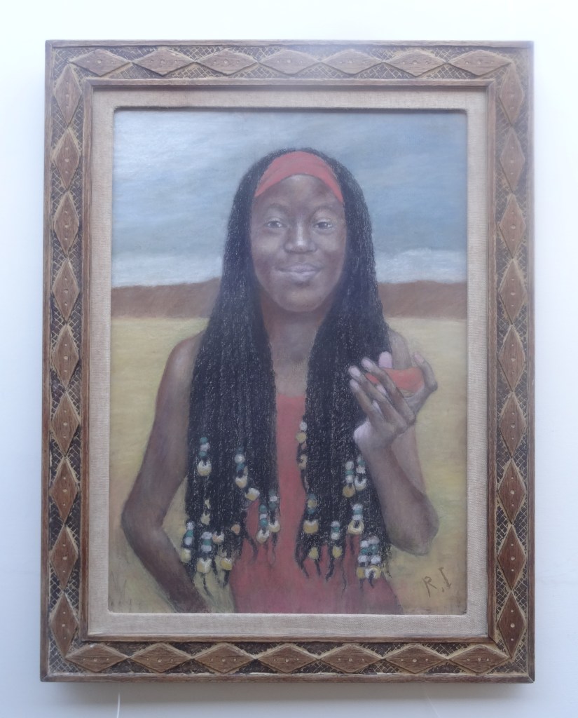 The model is Jersey. She is depicted in an African landscape. The beaded hair, so typically African, begged to be painted. She is holding a piece of fruit in her left hand. Jersey’s soft smile shows the confidence a young girl has when she is sure of the man looking at her. It is a wonderful thing to see in a young girl and depict in a painting.