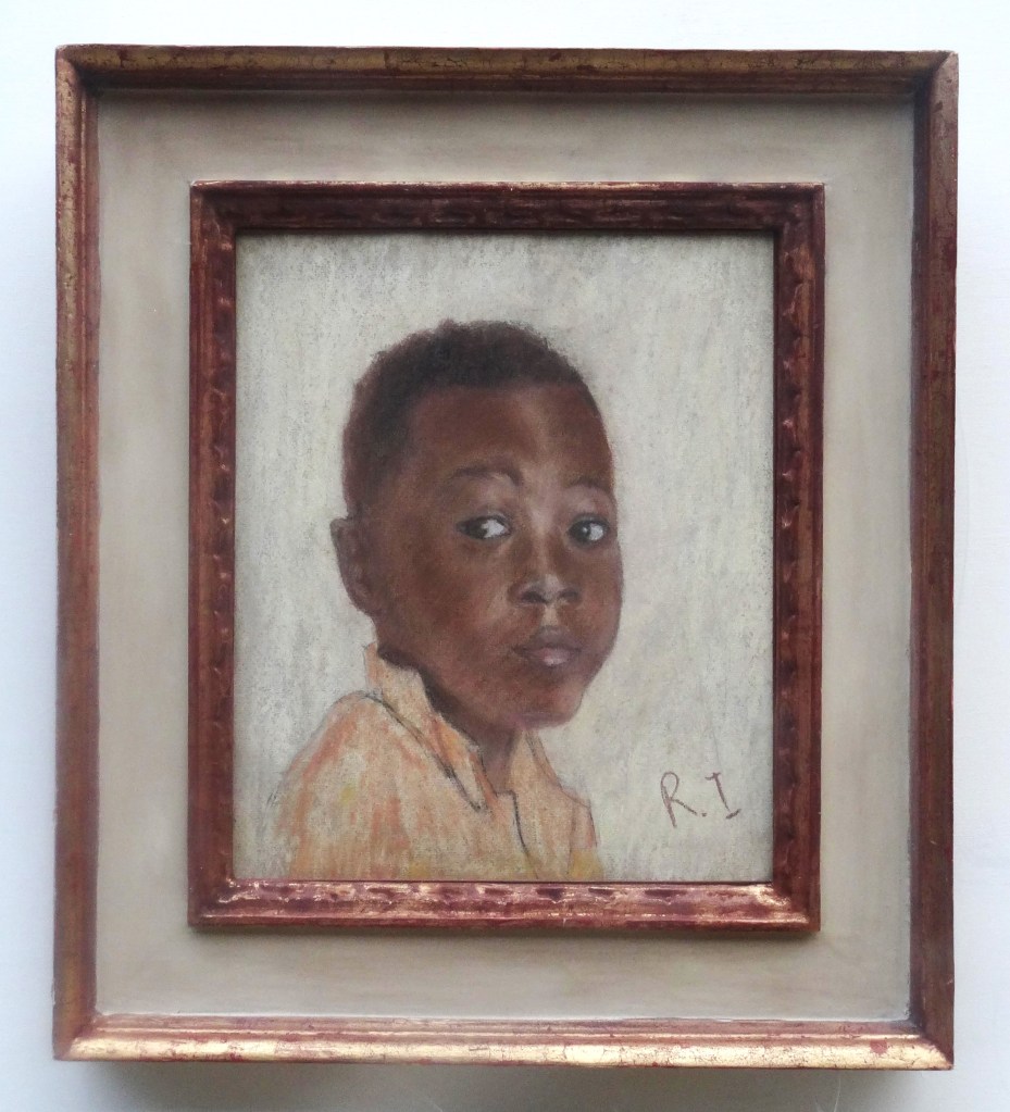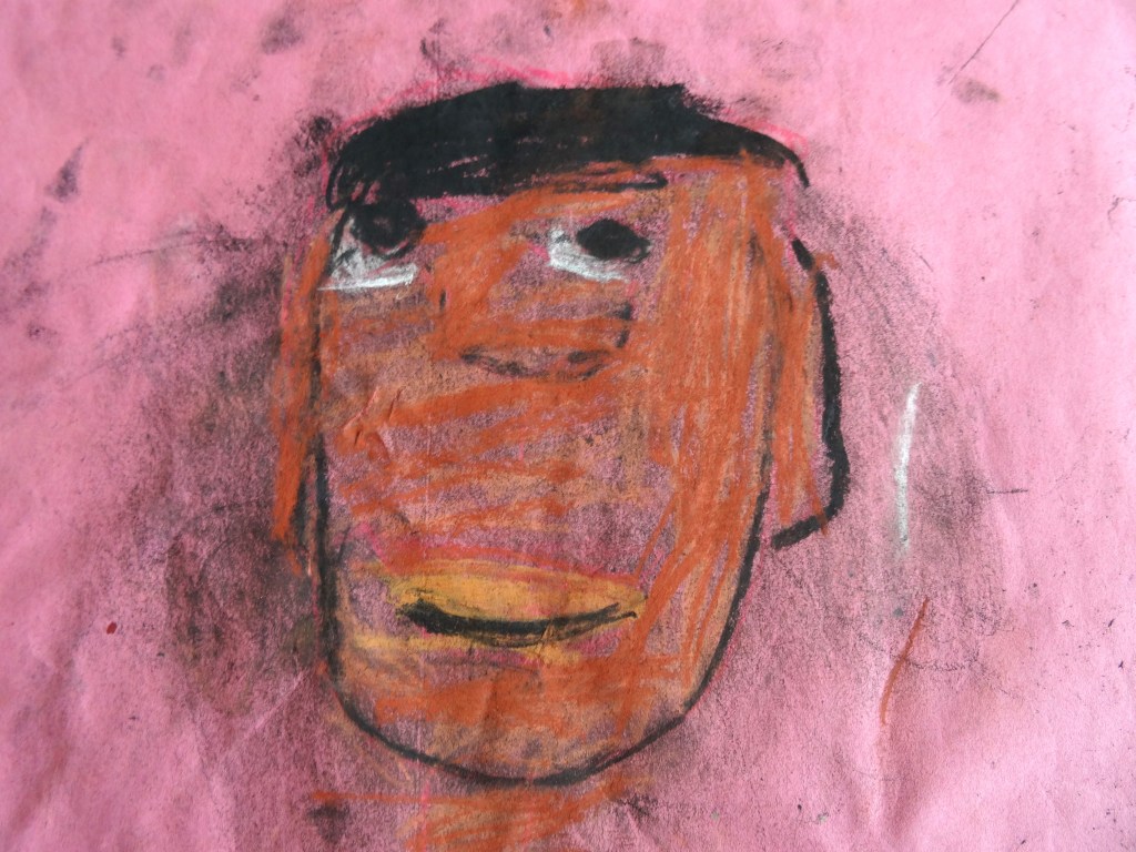 Gael, self portrait executed in soft pastel at the age of six. The portrait was painted without the use of a mirror. It demonstrates the inherent ability of an African to stylize an image. He managed to put in all the essentials. Gael’s original choice of subject matter was the cartoon characters which interested him.