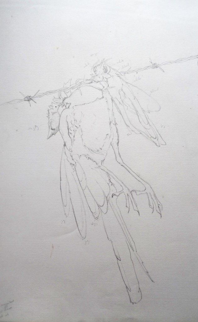 The Artist saw the bird hung on barbed wire. Shepherds in the area believe magpies kill baby lambs. They see magpies consuming dead lambs. It is generally accepted they are carrion birds. They eat lambs already dead. They do not kill new-born lambs. They give a useful service and do not deserve to be killed for it. The Artist felt regret at the premature death of the bird. He returned with pencil and paper to make the drawing. He added colour notes with a view to making a painting. Later he created a water-colour of the image. It is entitled ‘You Should Have Buried It.’